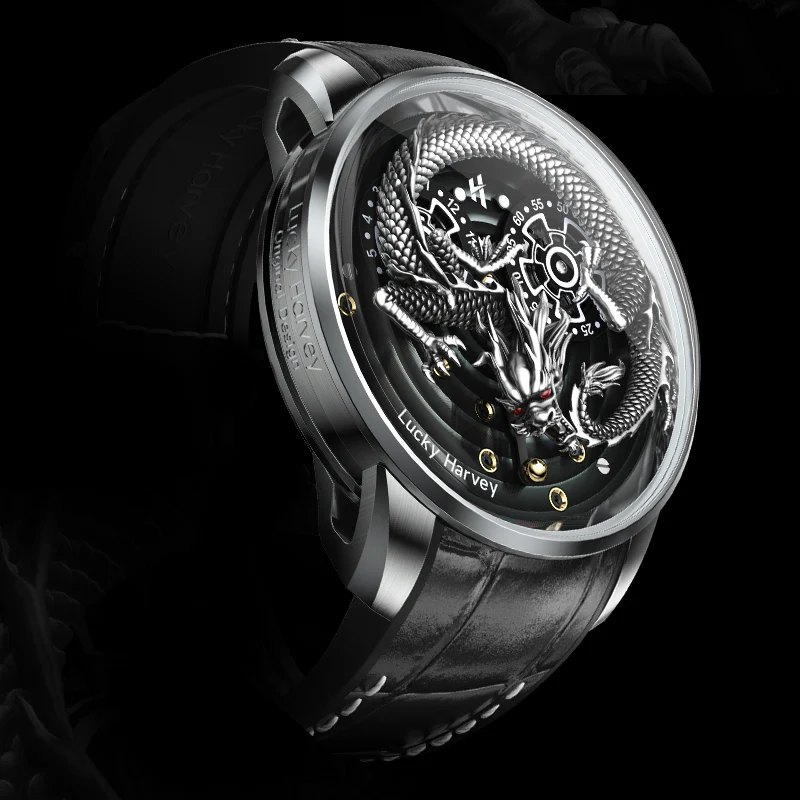 The dragon, a symbol of supreme authority and good fortune, has long been revered as a powerful and auspicious figure. Drawing on this ancient symbolism, Lucky Harvey has created a timepiece that seamlessly blends tradition and innovation. This exceptional watch features a finely carved dragon in 925 silver, hand-engraved and hand-painted, encircling the dial. Its intricate design is brought to life with stunning coloration and craftsmanship.
